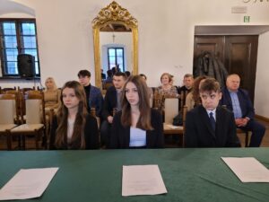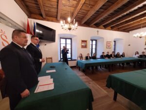 Na pierwszym posiedzeniu młodzi radni złożyli uroczyste ślubowanie i odebrali od burmistrza Marcina Marca i przewodniczącego rady miejskiej Wojciecha Czerwca oficjalne powołanie do rady.