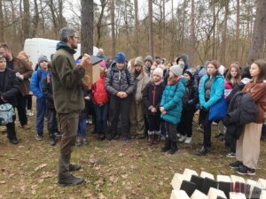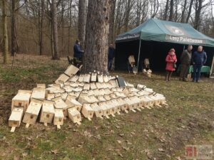 Ornitolog Arnold Cholewa opowiedział uczestniczącym w dzisiejszym wydarzeniu młodym ludziom o roli budek lęgowych w rozmnażaniu ptaków. Na drzewach zawieszono sześć rodzajów budek lęgowych.
