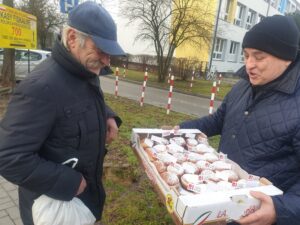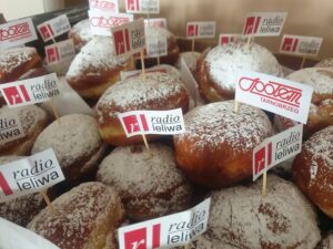 100 pączków od Radia Leliwa ze Spółdzielni SPOŁEM w Tarnobrzegu trafiło dziś do mieszkańców miasta. Pyszne specjały, przed tarnobrzeska redakcją Radia Leliwa, przy ulicy Wyspiańskiego, rozdawali prezes radia Bogusław Szwedo oraz reporterzy Ewa Wójcik Lis i Dominik Siatrak. Przechodnie bardzo chętnie zdradzali jakie pączki lubią najbardziej ile ich dziś zamierzają zjeść, ale nie tylko. Posłuchajcie…