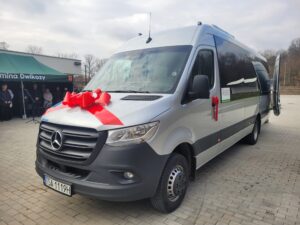 Dzieci z niepełnosprawnościami w gminie Dwikozy będą jeździć nowym autobusem. To 24-osobowy mercedes. Samochód wyposażony jest w nowoczesną rampę najazdową, poręcz ułatwiającą wejście do autobusu, a tylne fotele pasażerskie przystosowane są do szybkiego demontażu w celu zwolnienia miejsca dla wózka inwalidzkiego, podłoga pokryta jest antypoślizgową wykładziną.