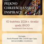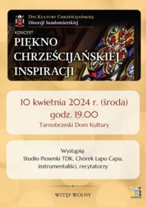 Koncert nosi tytuł „Piękno chrześcijańskiej inspiracji”. Wystąpią wokalistki Studia Piosenki TDK: Emilia Gonciarz, Hanna Hałka, Julia Komada, Julia Mianowska, Natalia Ura, Aniela Roman, Chórek Łapu Capu, a także saksofonistka Amelia Kopeć oraz recytatorzy Grupy Teatralnej TDK. Będzie można usłyszeć utwory muzyczne i poetyckie tematycznie nawiązujące do radości życia, relacji międzyludzkich, przyrody. Wśród nich znajdą się znane melodie i słowa, ale także nowe aranżacje, czy mniej popularne kompozycje.