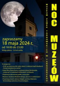 Muzeum-Zamek Tarnowskich w Tarnobrzegu w sobotę będzie można zwiedzać w godzinach od 18.00 do 23.00. W programie wydarzenia: o godzinie 18.30 gra terenowa dla rodzin pod nazwą „Poznaj mieszkańców zamku”. Zostanie też wyświetlony film historyka Piotra Dumy o wystawie obrazu Rembrandta „Lisowczyk” w Łazienkach Królewskich i na Wawelu. W sobotę, odwiedzający tarnobrzeskie muzeum będą mieli okazję zobaczyć odnowioną grafikę „Lisowczyka”, wystawę Jarosława Modzelewskiego pod tytułem „Sacrum w codzienności”, a także dwa szkice Matejki i portret Waleriana Tarnowskiego autorstwa Artura Grottgera. Tego wieczoru wstęp do Zamku Dzikowskiego za symboliczną cegiełkę.