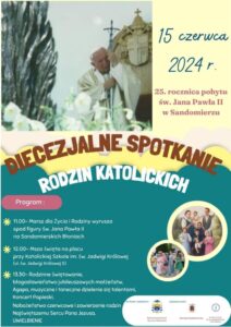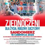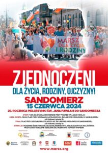 W najbliższą sobotę (15 czerwca) o godzinie 11.00 na sandomierskich błoniach odbędzie się modlitwa przy figurze św. Jana Pawła II. Stamtąd wyruszy Marsz dla Życia i Rodziny, którego uczestnicy dotrą na tereny zielone przy szkołach katolickich w sąsiedztwie wąwozu królowej Jadwigi. Tam o godzinie 12 00 rozpocznie się msza święta polowa, potem będzie miało miejsce błogosławieństwo jubileuszowych małżeństw, koncert i wielki piknik rodzinny. O godzinie 18.00 zaplanowano nabożeństwo czerwcowe połączone z zawierzeniem rodzin Najświętszemu Sercu Jezusa i uwielbienie.