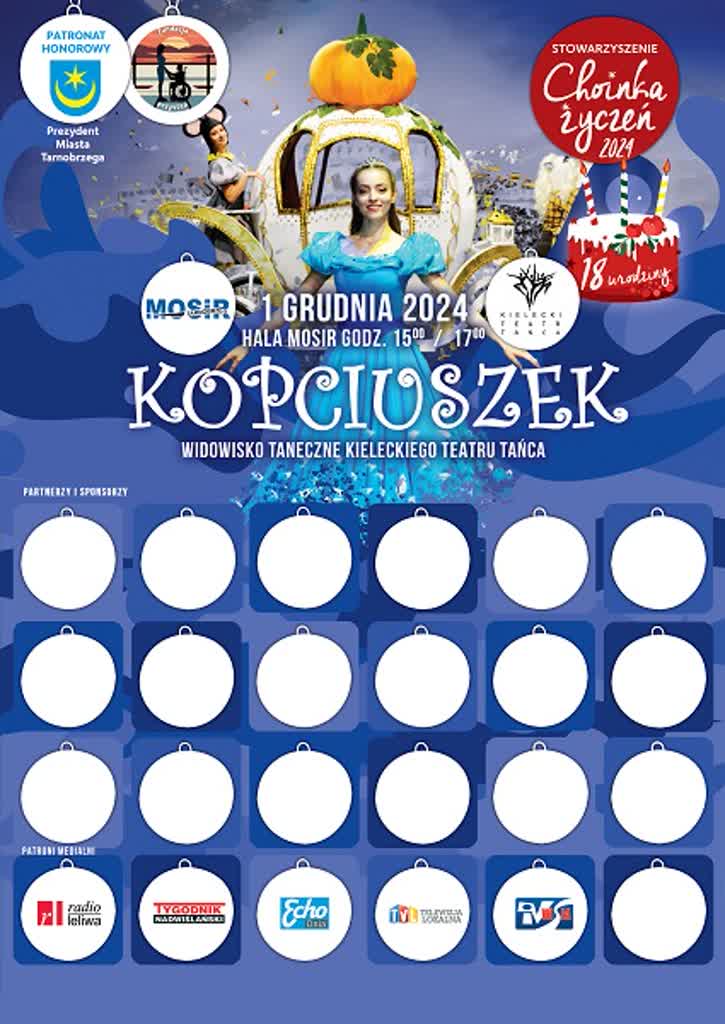 W przestrzeni wirtualnej jest już plakat promujący tegoroczne widowisko „Kopciuszek”, które w ramach „Choinki Życzeń” już 1 grudnia, w hali MOSiR zaprezentuje Kielecki Teatr Tańca. Część miejsc na plakacie zajmują niewypełnione bombki. To przestrzenie na loga partnerów i sponsorów akcji.