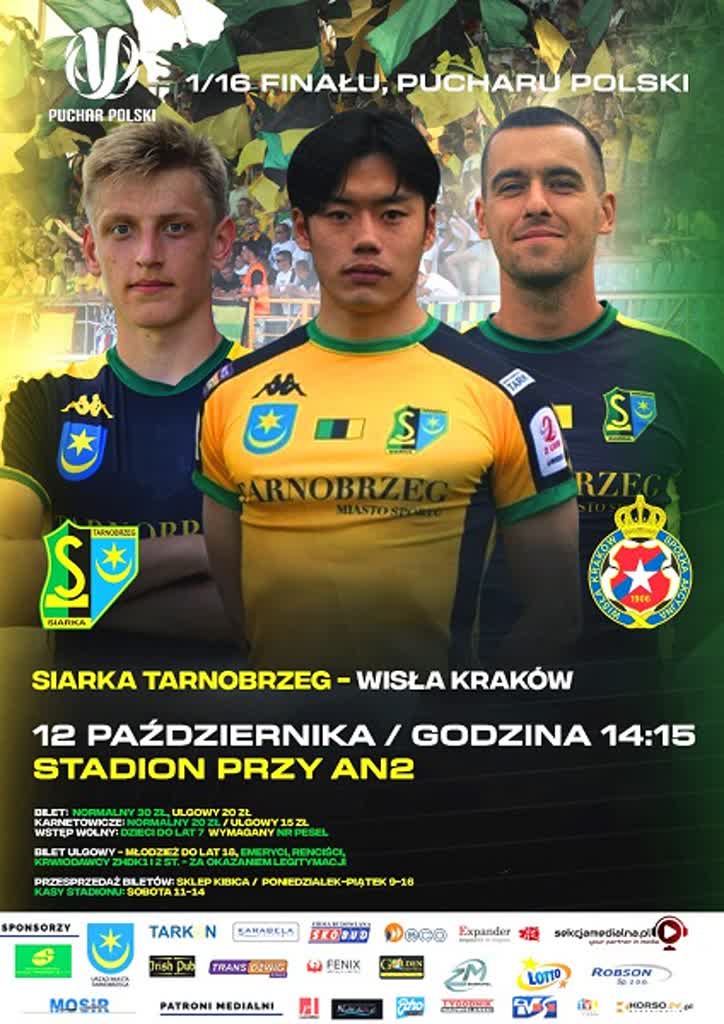 W najbliższą sobotę, 12 października, trzecioligowa Siarka Tarnobrzeg zagra z pierwszoligową Wisłą Kraków. Pojedynek piłkarski, w ramach 1/16 finału Pucharu Polski, rozpocznie się o godzinie 14.15, na Stadionie Miejskim, przy Alei Niepodległości. Są jeszcze bilety na to widowisko sportowe.