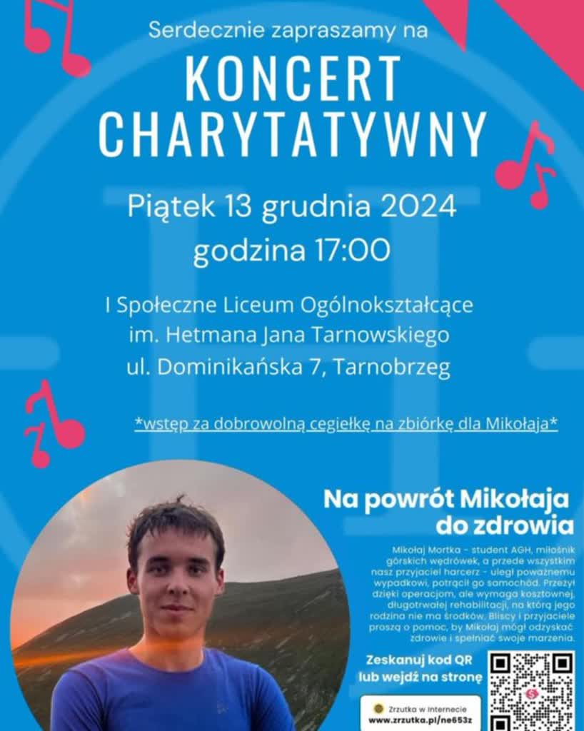 Koncert charytatywny dla Mikołaja Mortki z Tarnobrzega organizuje I Społeczne Liceum Ogólnokształcące imienia Hetmana Jana Tarnowskiego w Tarnobrzegu. Wydarzenie odbędzie się w najbliższy piątek, 13 grudnia, o godzinie 17.00, w siedzibie szkoły, przy ulicy Dominikańskiej 7.