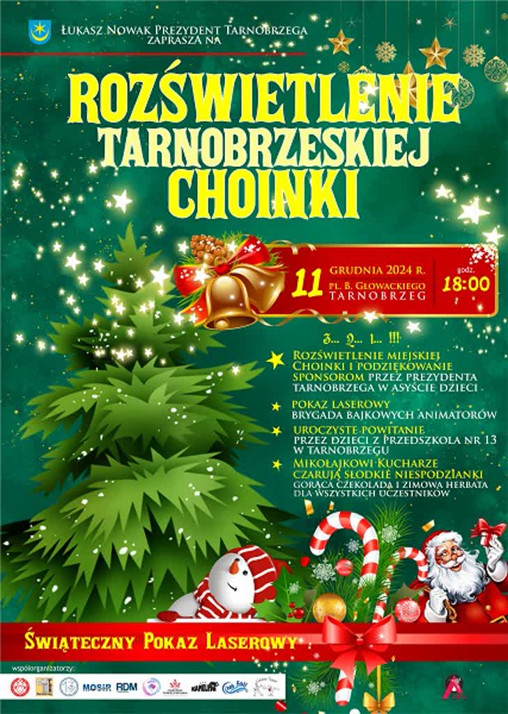 O godzinie 18.00 choinka na Placu Bartosza Głowackiego rozbłyśnie światełkami, które uruchomi prezydent miasta Łukasz Nowak w asyście dzieci oraz sponsorów. To dzięki sponsorom możliwa była akcja wypożyczenia miejskiej choinki dla Tarnobrzega.