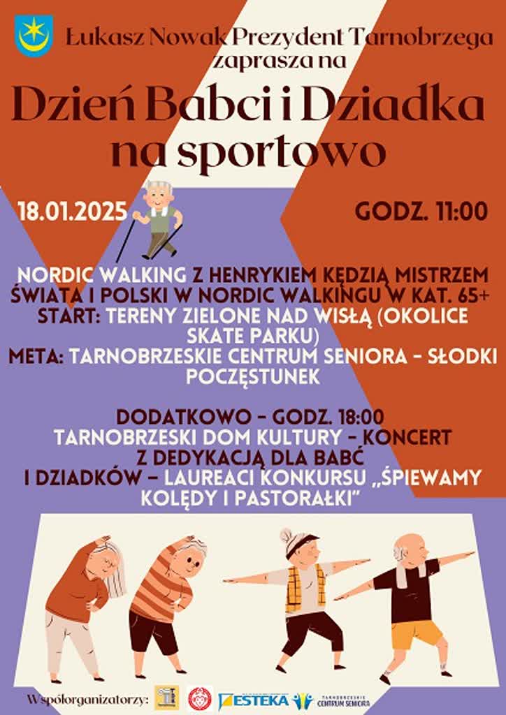 Sportowa i kulturalna propozycja dla babć i dziadków z okazji ich nadchodzącego święta. W najbliższą sobotę, 18 stycznia, na terenach zielonych nad Wisłą w Tarnobrzegu babcie i dziadkowie będą mieli możliwość trenowania z mistrzem świata i Polski w nordic walkingu w kategorii 65+ – Henrykiem Kędzią. Spacer rozpocznie się o godzinie 11.00 w okolicy skate parku, a zakończy słodkim poczęstunkiem w Tarnobrzeskim Centrum Seniora, przy Placu Bartosza Głowackiego.