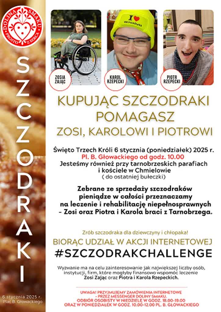 Stowarzyszenie Dolina Smaku, również w tym dniu zaprasza do wsparcia akcji charytatywnej pod nazwą „Szczodraki”. W jej ramach sprzedawane będą bułeczki szczęścia. Dochód zostanie przeznaczony na rehabilitację Zosi Zając z Chmielowa oraz braci Karola i Piotra Rzepeckich z Tarnobrzega.