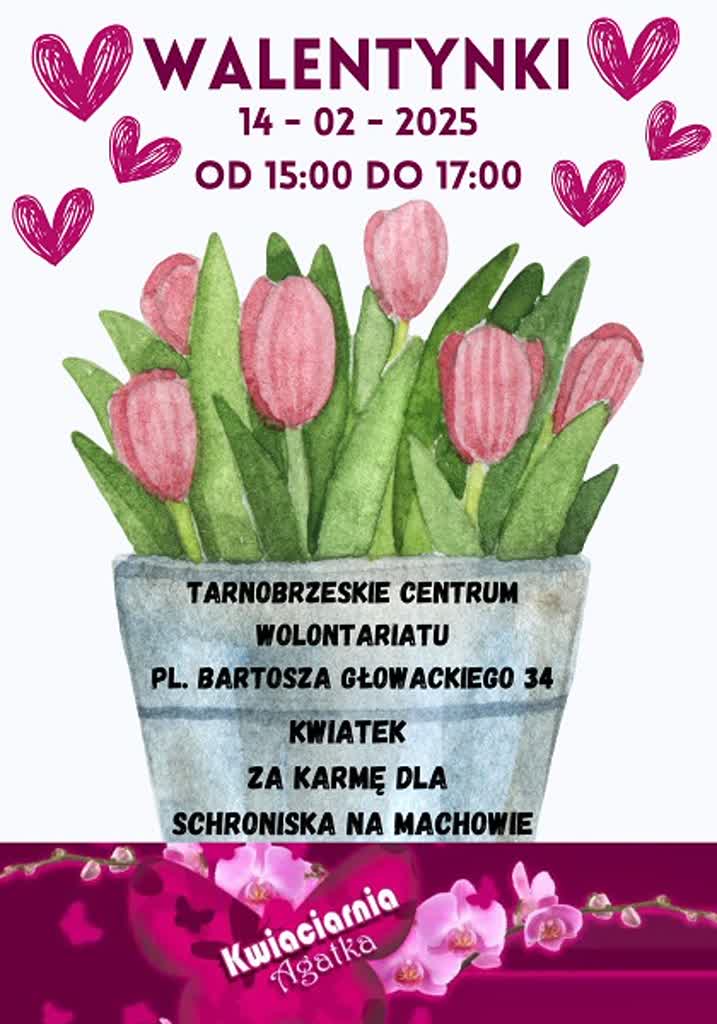 „Kwiatek za karmę dla schroniska w Machowie”. Ze szczytną akcją z okazji Walentynek wychodzi Tarnobrzeskie Centrum Wolontariatu. 14.00 lutego każdy, kto przyniesie do siedziby centrum karmę dla psa lub kota otrzyma kwiat z kwiaciarni „Agatka”.