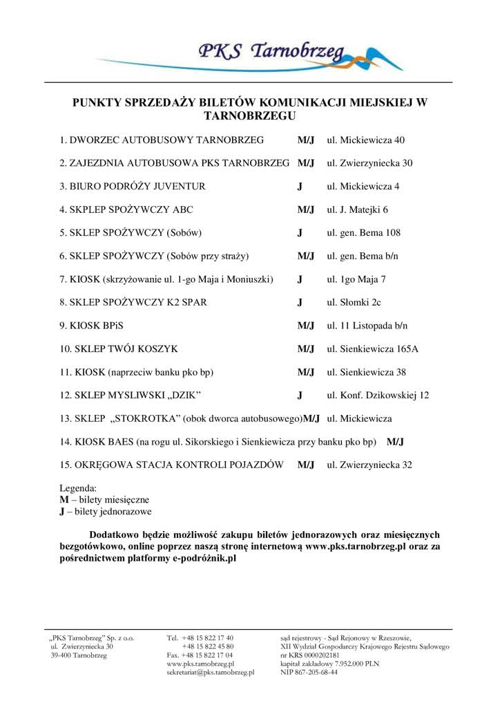 Na naszej stronie internetowej znajdą Państwo zaktualizowany wykaz punktów sprzedaży biletów, uwzględniający również miejsca sprzedaży biletów.