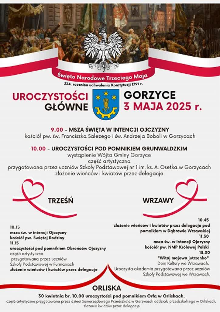 Trzeciomajowe uroczystości w Gorzycach rozpoczną się o godzinie 9.00 mszą świętą w intencji Ojczyzny, w kościele pw. Św. Franciszka Salezego i św. Andrzeja Boboli.