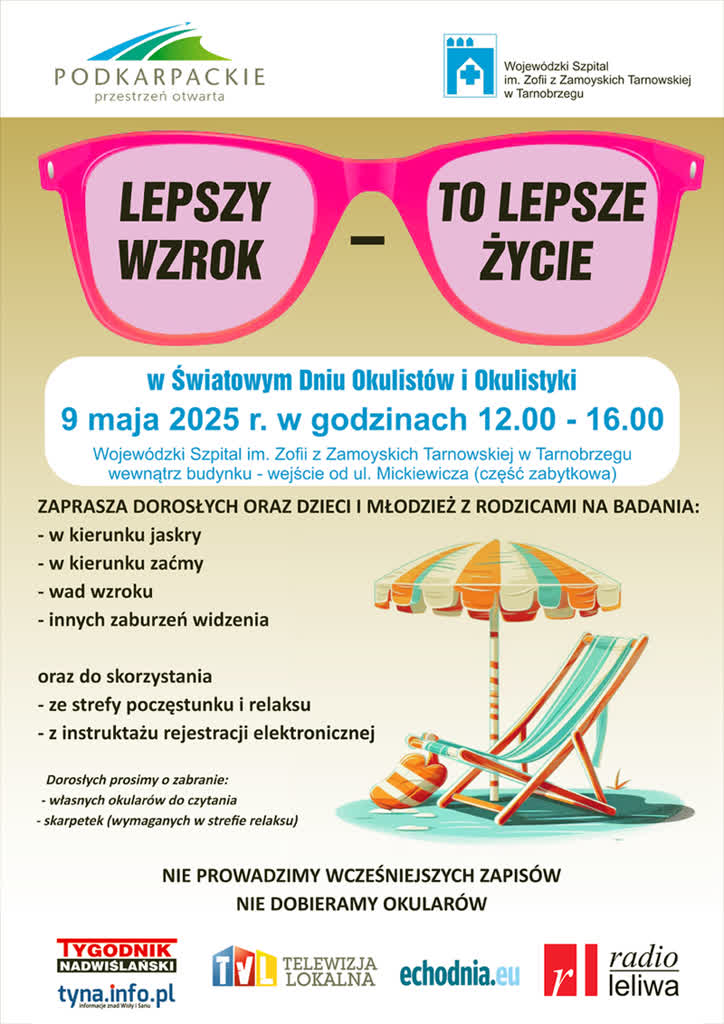 Dorośli powinni zabrać ze sobą własne okulary. Akcja odbędzie się w budynku tarnobrzeskiego szpitala. Wejście od ulicy Mickiewicza. Patronat medialny – Radio Leliwa.