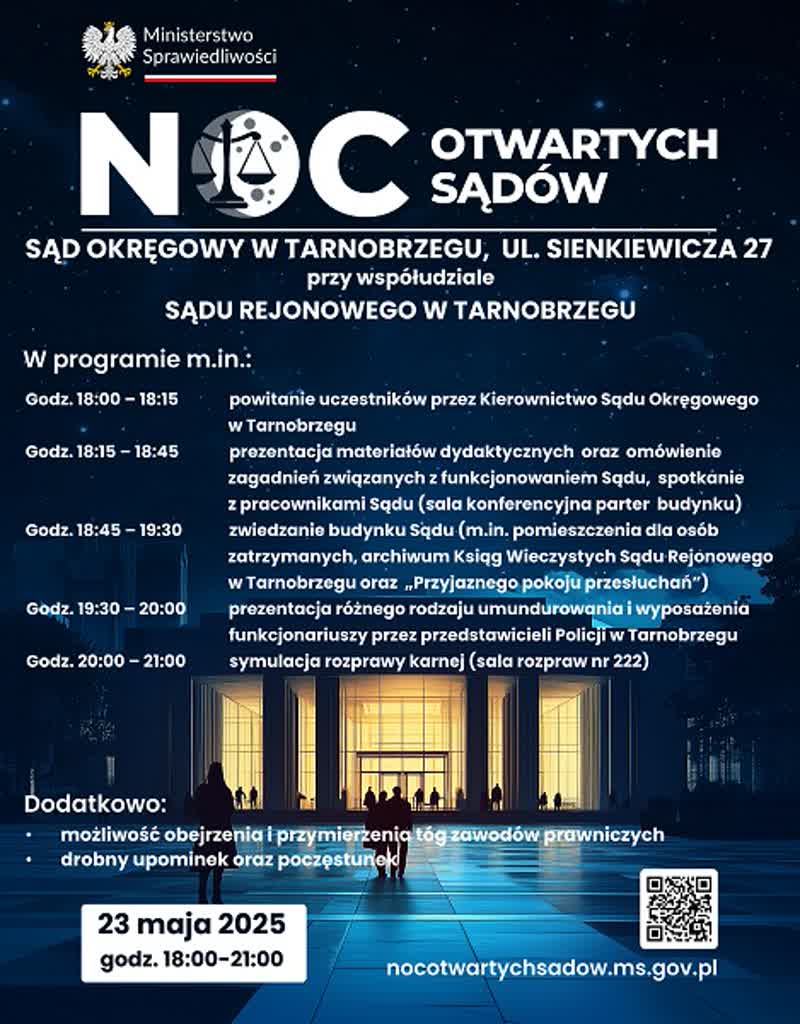 Sąd Okręgowy w Tarnobrzegu zaprasza na dzień otwarty w ramach akcji „Noc Otwartych Sądów”. W piątkowy wieczór, 23 maja, będzie można zajrzeć do pomieszczenia dla osób zatrzymanych, archiwum Ksiąg Wieczystych Sądu Rejonowego w Tarnobrzegu oraz „Przyjaznego pokoju przesłuchań”. Przewidziano też symulacje sprawy karnej.