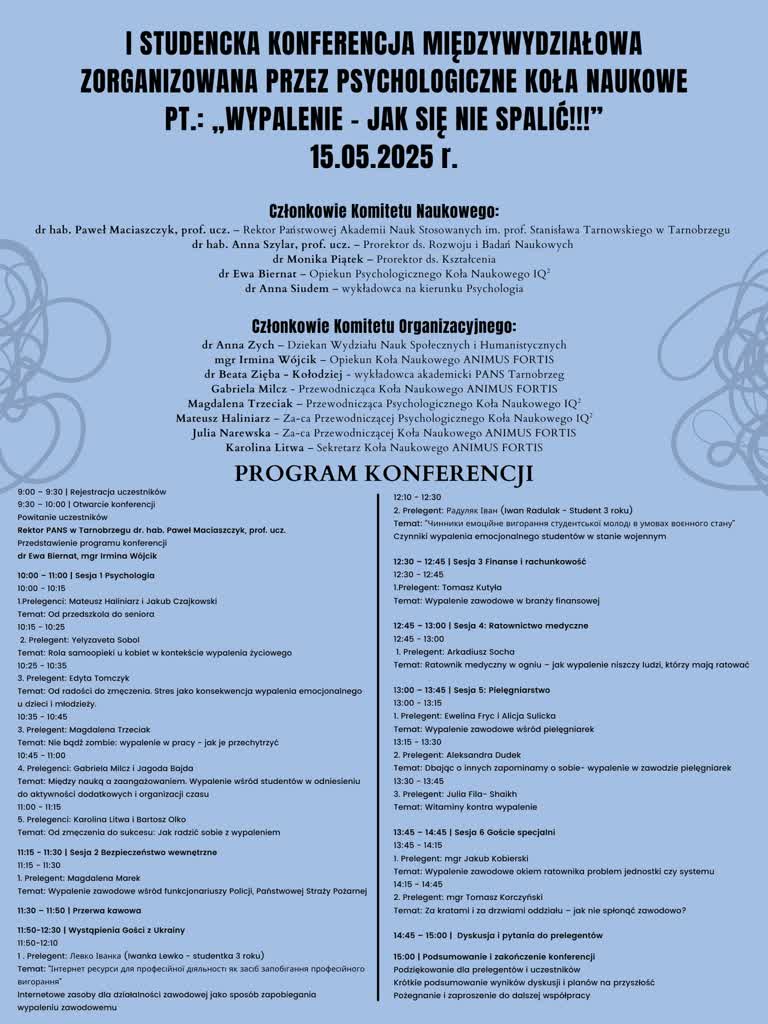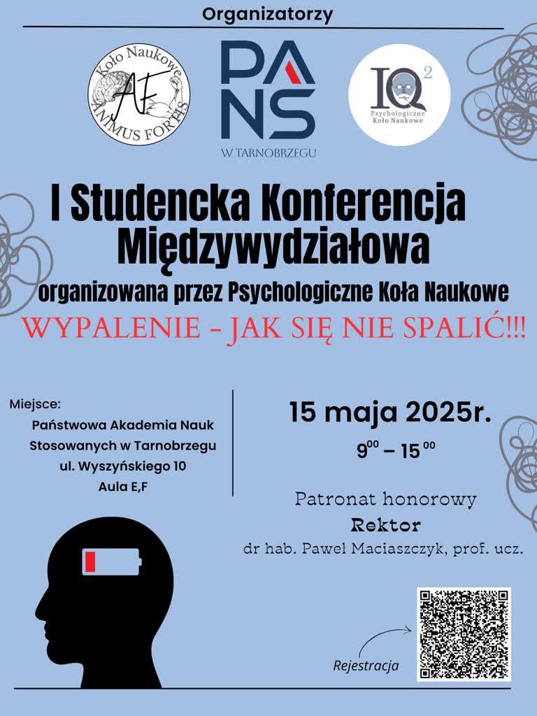 I Studencka Konferencja Międzywydziałowa pod tytułem „Wypalenie – jak się nie spalić!!!”, odbędzie się w najbliższy czwartek, 15 maja, w Państwowej Akademii Nauk Stosowanych w Tarnobrzegu, przy ulicy Kardynała Stefana Wyszyńskiego. Wydarzenie jest otwarte.