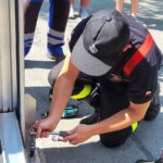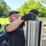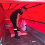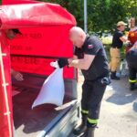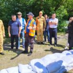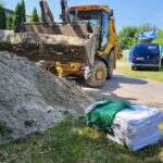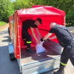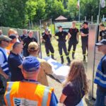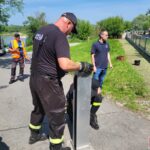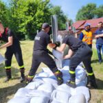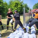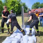 Strażacy ćwiczyli rozkładanie i montaż mobilnej zapory przeciwpowodziowej oraz układanie worków z piaskiem celem zapobiegania ewentualnym przesiąkom.