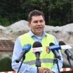 Konferencja dotycząca pozyskanych pieniędzy na inwestycje retencyjno-odwodnieniowe odbyła się przy przebudowywanych Kaczych Dołach.