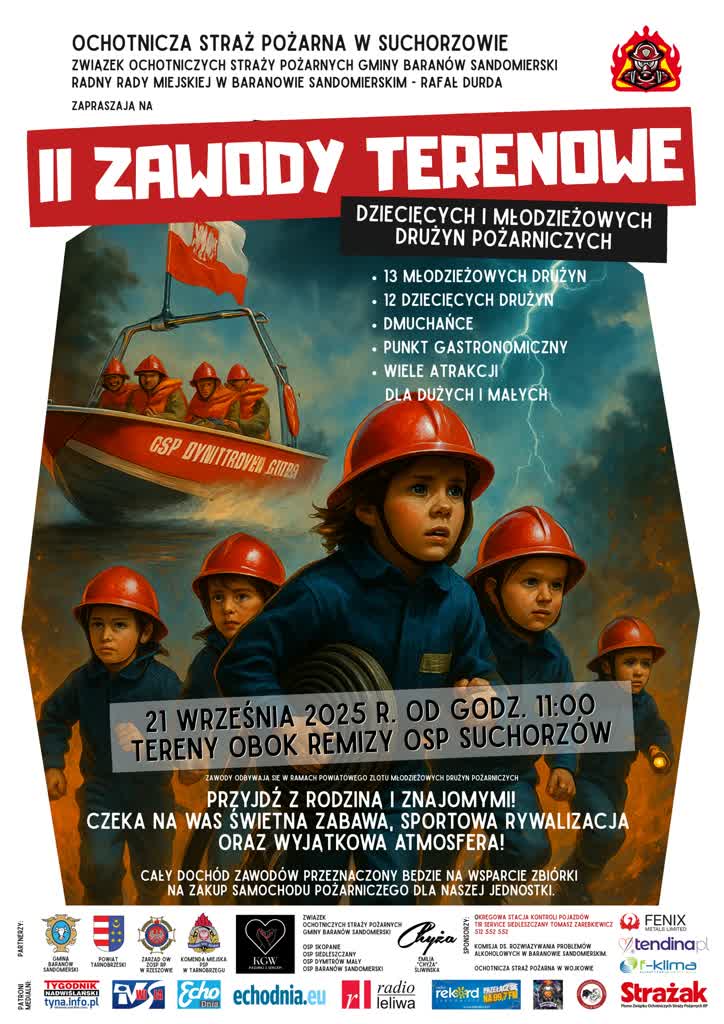 II Terenowe Zawody Dziecięcych i Młodzieżowych Drużyn Pożarniczych odbędą się w najbliższą niedzielę w Suchorzowie w gminie Baranów Sandomierski. Zostaną one rozegrane na terenach przy miejscowej remizie Ochotniczej Straży Pożarnej. Młodzi druhowie będą rywalizować zarówno na lądzie jak i na wodzie.