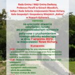 Rada gminy i wójt gminy Dwikozy, proboszcz parafii w Górach Wysokich, sołtys i rada sołecka w miejscowości Nowe Kichary oraz Koło Gospodyń i Gospodarzy Wiejskich „Kalina” zapraszają na uroczyste otwarcie zabytkowej baszty po przeprowadzonym remoncie połączone z uruchomieniem nowego odcinka wodociągu.