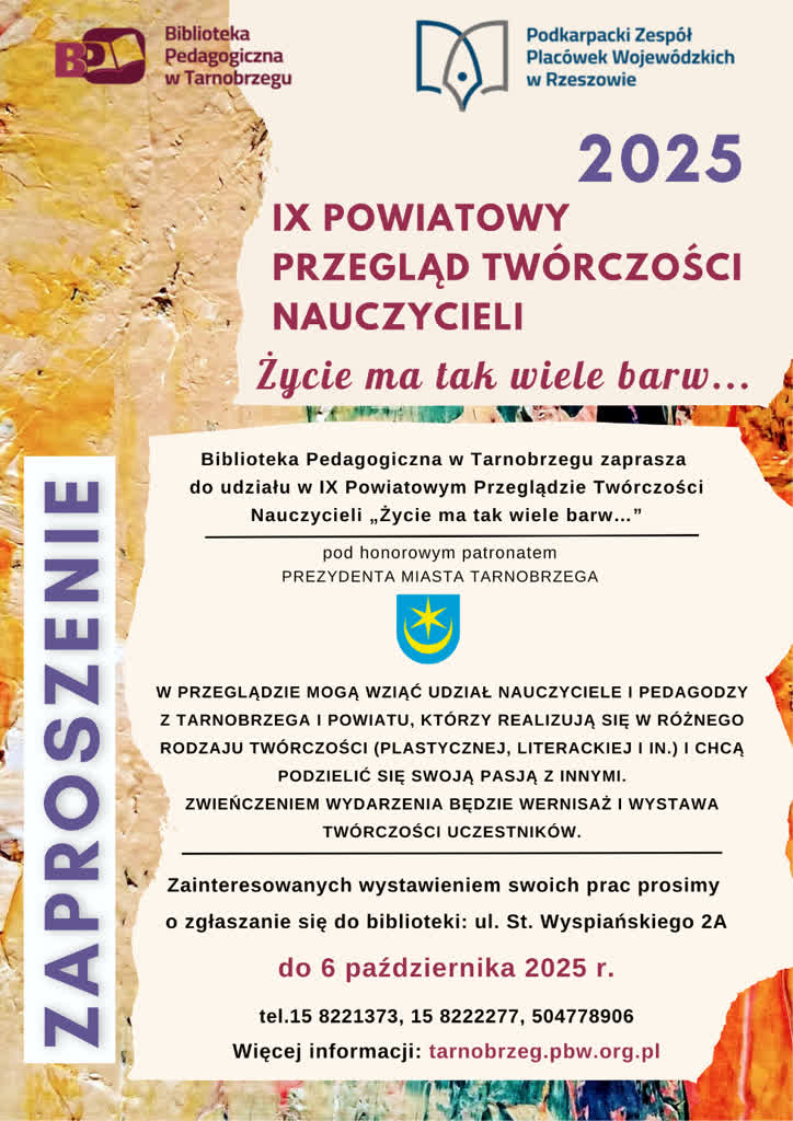 Biblioteka Pedagogiczna w Tarnobrzegu zaprasza nauczycieli i pedagogów z powiatu tarnobrzeskiego i Tarnobrzega do udziału w IX Powiatowym Przeglądzie Twórczości Nauczycieli pod hasłem „Życie ma tak wiele barw”.