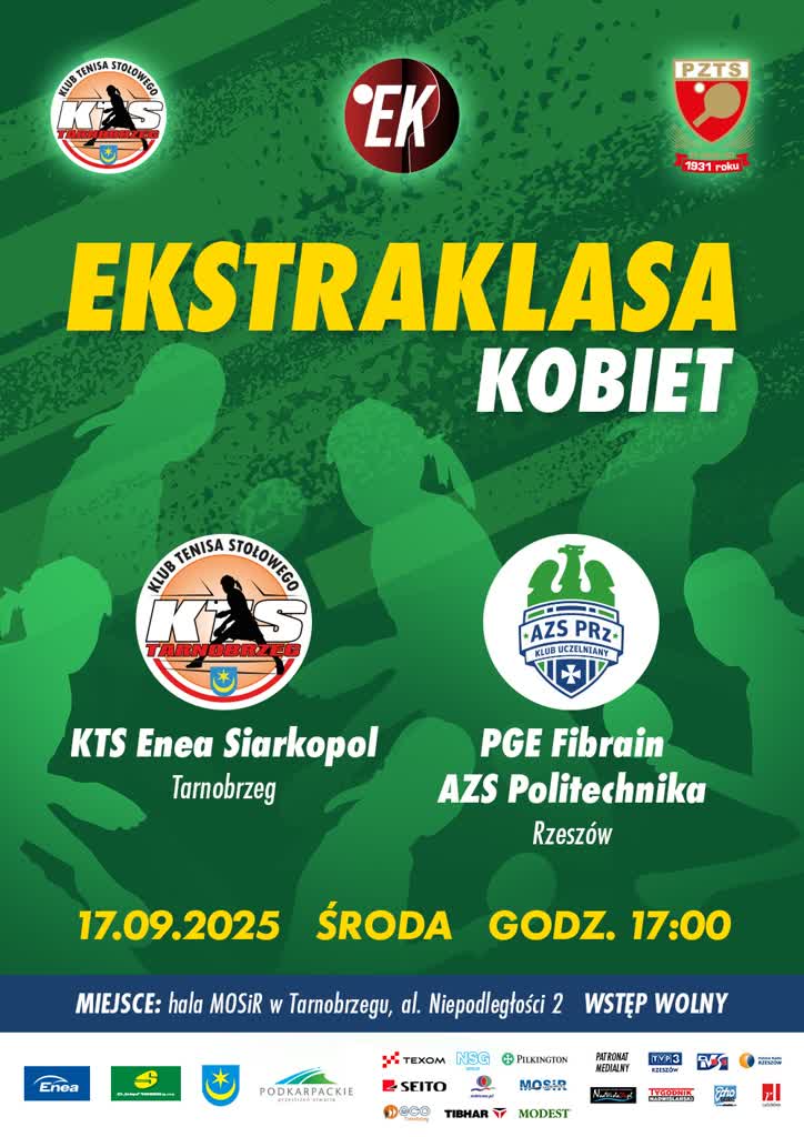 W środę, 17 września w Tarnobrzegu mecz Ekstraklasy Kobiet w tenisie stołowym. Drużyna KTS Enea Siarkopol Tarnobrzeg zmierzy się z zawodniczkami PGE Fibrain AZS Politechnika Rzeszów.