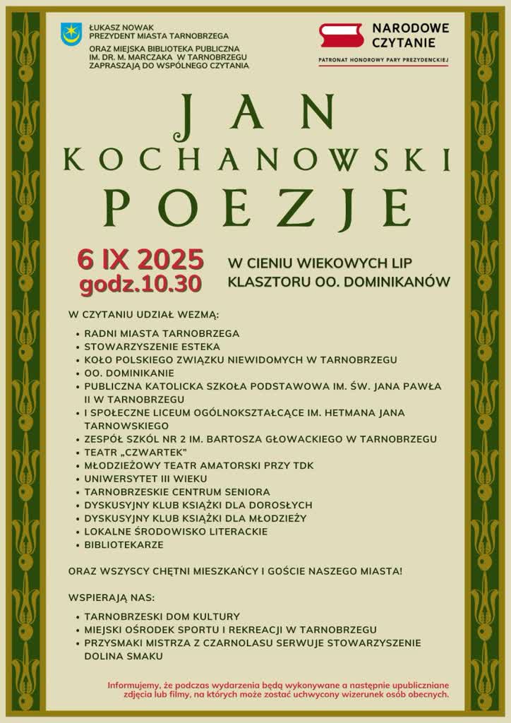 Oryginalna odsłona Narodowego Czytania w Tarnobrzegu. W sobotę, 6 września o godzinie 10:30 mieszkańcy oraz goście będą wspólnie czytać dzieła Jana Kochanowskiego pod wiekowymi lipami klasztoru Ojców Dominikanów. Głównym organizatorem przedsięwzięcia jest Miejska Biblioteka Publiczna w Tarnobrzegu.