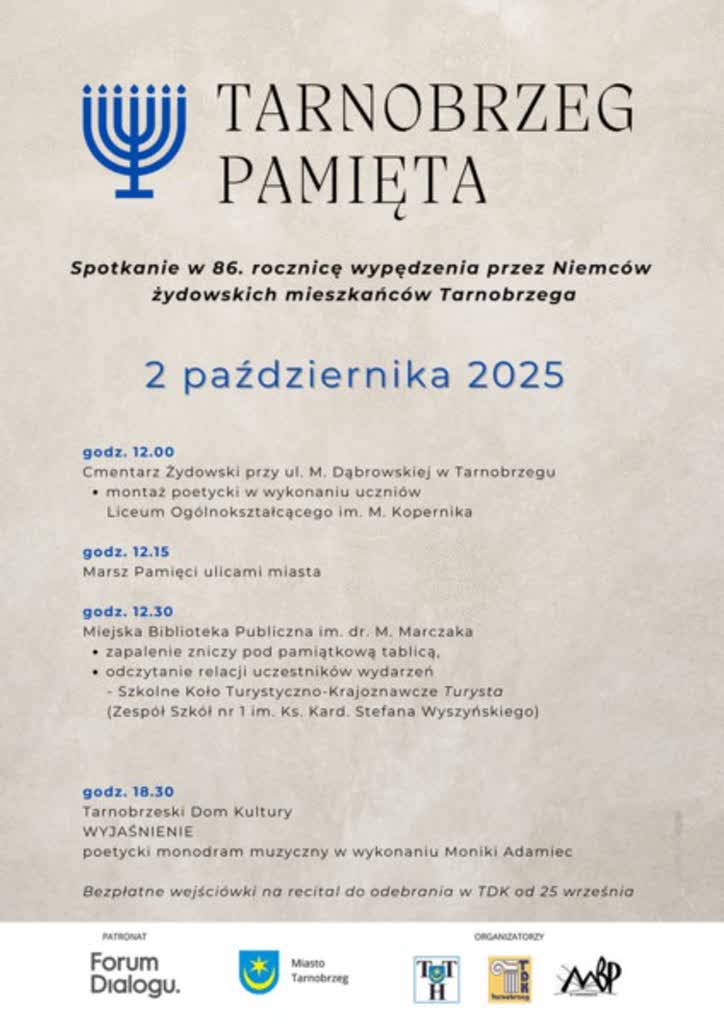 Uczestnicy spotkają się w południe na Cmentarzu Żydowskim przy ulicy Marii Dąbrowskiej, gdzie zostaną przypomniane okoliczności dramatycznych wydarzeń. Profesor Tadeusz Zych opowie o roli społeczności żydowskiej w przedwojennym mieście. Młodzież z Liceum Ogólnokształcącego imienia Mikołaja Kopernika w Tarnobrzegu zaprezentuje montaż poetycki.