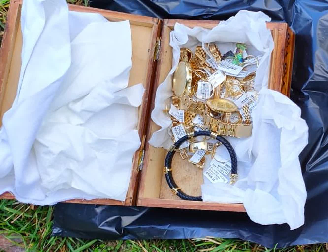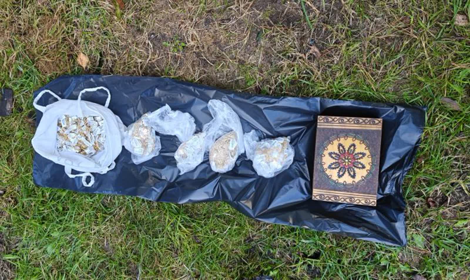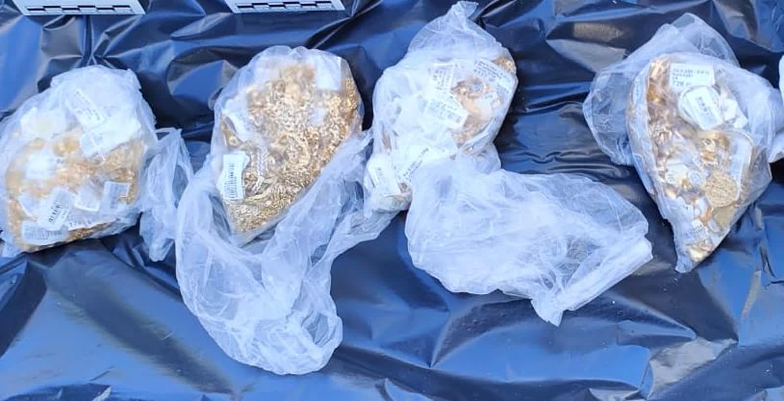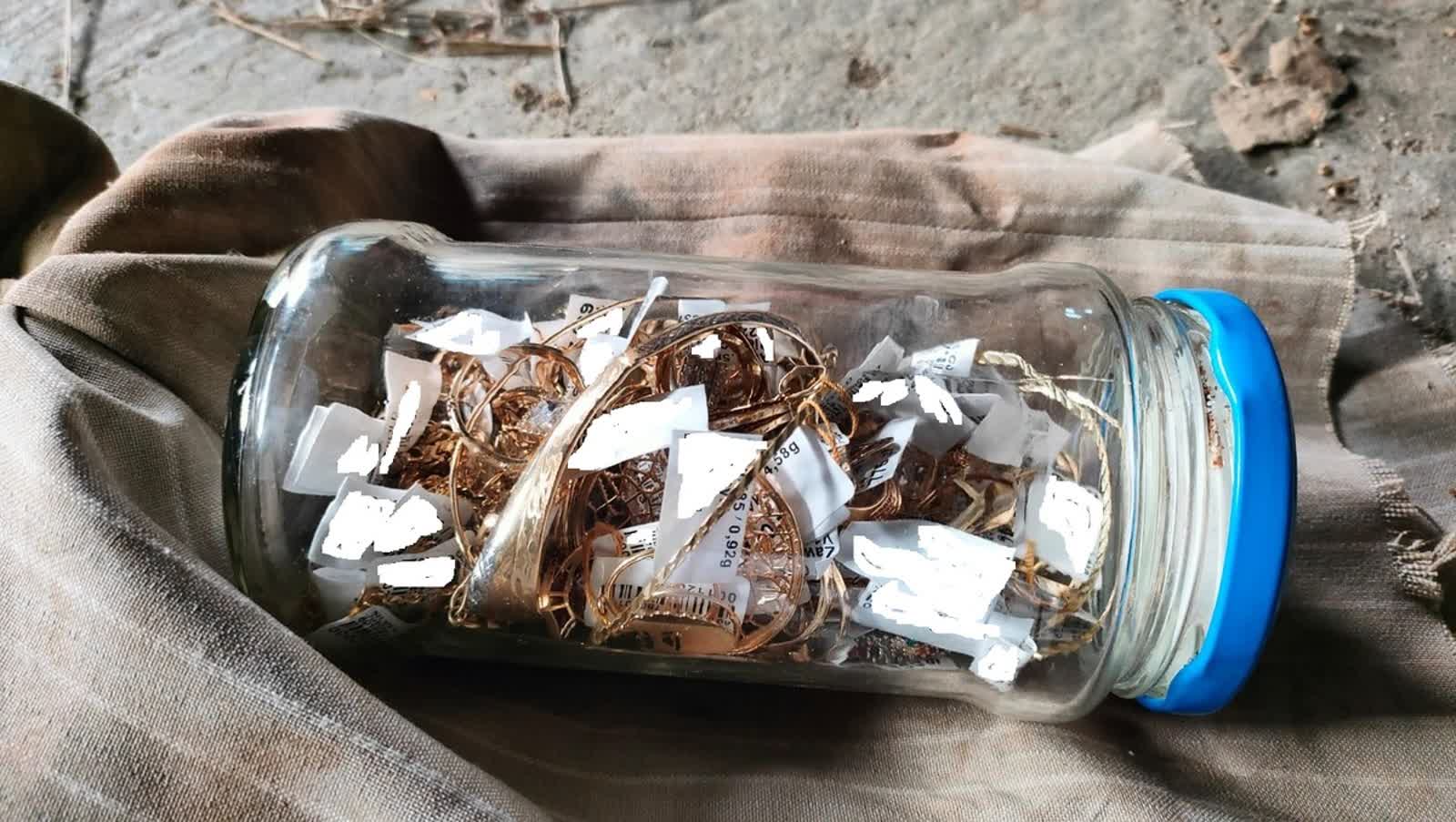 Zapakowane do reklamówek złote łańcuszki, pierścionki i bransoletki policjanci ujawnili w miejscu zamieszkania 39-latka. Część z nich była zakopana w przydomowym ogródku. Inna ukryta była w pomieszczeniu gospodarczym.