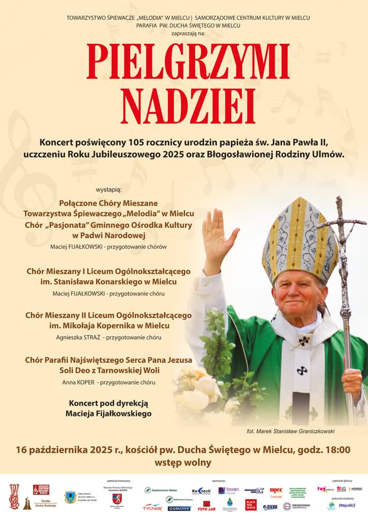 Już 16 października w kościele pw. Ducha Świętego w Mielcu odbędzie się wyjątkowy koncert pod tytułem „Pielgrzymi Nadziei”. Wydarzenie będzie muzycznym hołdem złożonym św. Janowi Pawłowi II z okazji 105. rocznicy jego urodzin, a także formą uczczenia Roku Jubileuszowego oraz Błogosławionej Rodziny Ulmów.