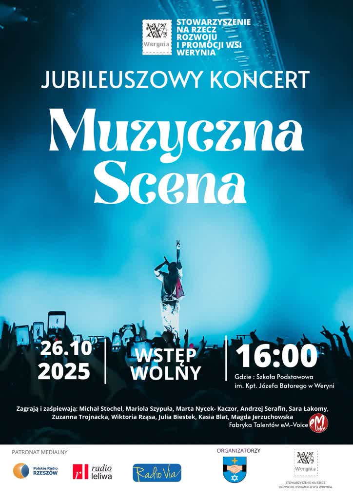 26 października o godz. 16:00 w Szkole Podstawowej im. kpt. Józefa Batorego w Weryni odbędzie się wyjątkowe wydarzenie artystyczne – jubileuszowa, 10. edycja koncertu „Muzyczna Scena”, organizowanego przez Stowarzyszenie na Rzecz Rozwoju i Promocji Wsi Werynia.