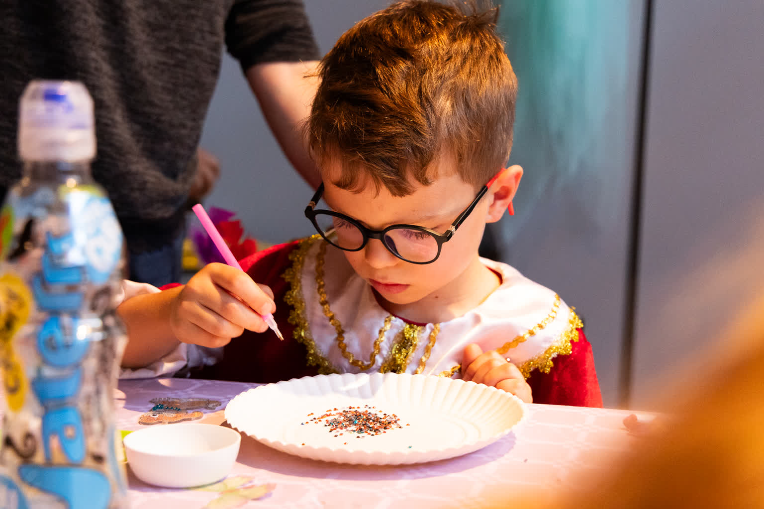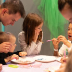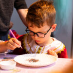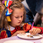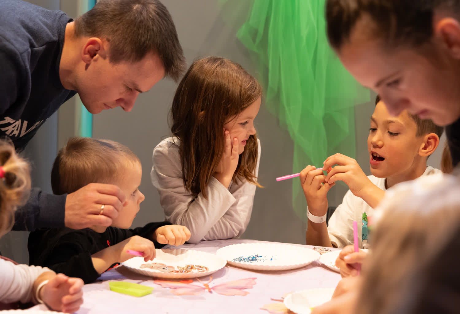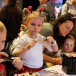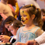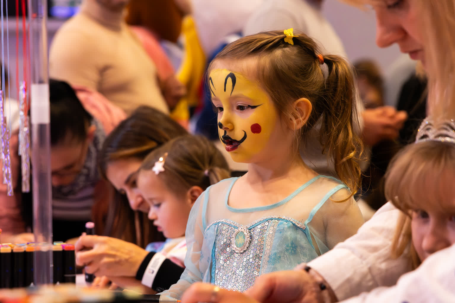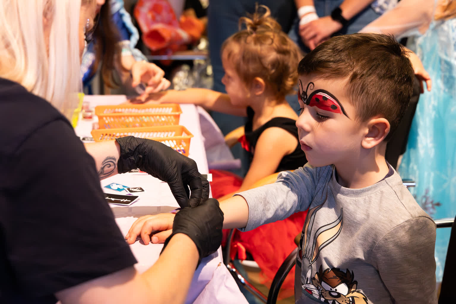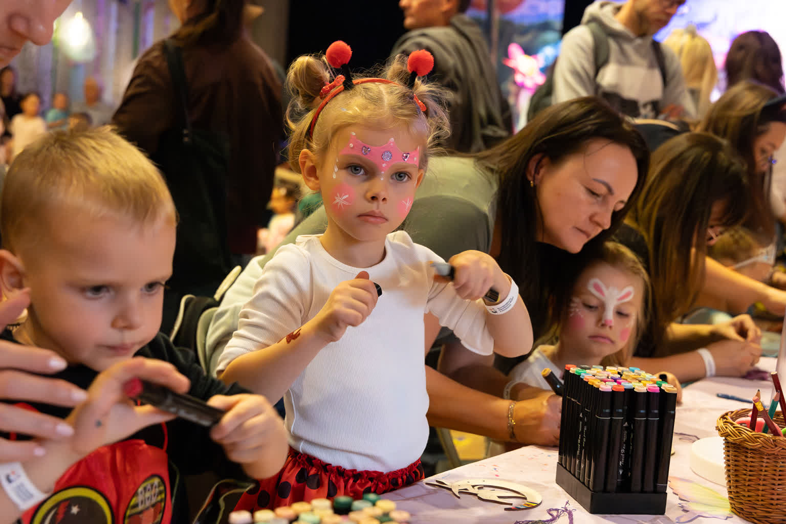 Nie zabrakło również twórczej zabawy! W strefach warsztatowych mali artyści tworzyli wietrzne dzwonki i diamentowe breloczki, które błyszczały w świetle jak prawdziwe skarby. Dużym zainteresowaniem cieszyły się też brokatowe tatuaże i malowanie twarzy – po chwili cała przestrzeń wypełniła się wróżkami, księżniczkami, piratami, motylkami i superbohaterami.