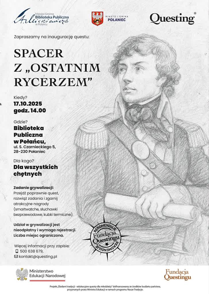 Miasto i Gmina Połaniec wspólnie z Miejsko-Gminną Biblioteką Publiczną im. Adama Mickiewicza w Połańcu zapraszają do udziału w inauguracji questu „Spacer z Ostatnim rycerzem” – wyjątkowej przygodzie, która pozwoli odkryć historię miasta z zupełnie nowej perspektywy.