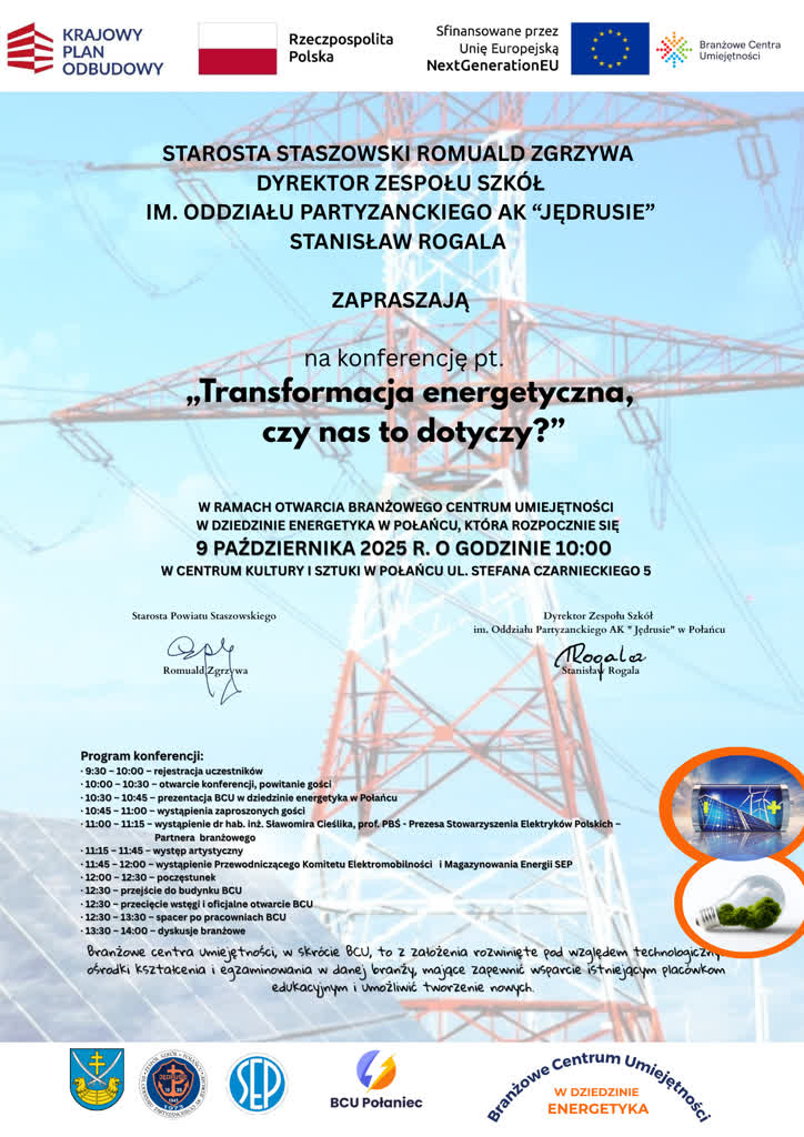 Starosta Powiatu Staszowskiego Romuald Zgrzywa oraz Dyrektor Zespołu Szkół im. Oddziału Partyzanckiego AK „Jędrusie” w Połańcu, Stanisław Rogala, zapraszają na uroczystą Ceremonię Otwarcia Branżowego Centrum Umiejętności w dziedzinie energetyki w Połańcu. Wydarzenie to będzie częścią konferencji zatytułowanej „Transformacja energetyczna – czy nas to dotyczy?”, która odbędzie się 9 października o godzinie 10:00 w Centrum Kultury i Sztuki przy ulicy Stefana Czarnieckiego 5 w Połańcu.