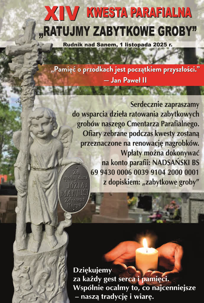 W Rudniku nad Sanem 1 listopada na cmentarzu parafialnym tradycyjnie odbędzie się kwesta 'Ratujmy zabytkowe groby’. Zebrane pieniądze pozwolą na odnowienie kolejnych zabytkowych nagrobków.