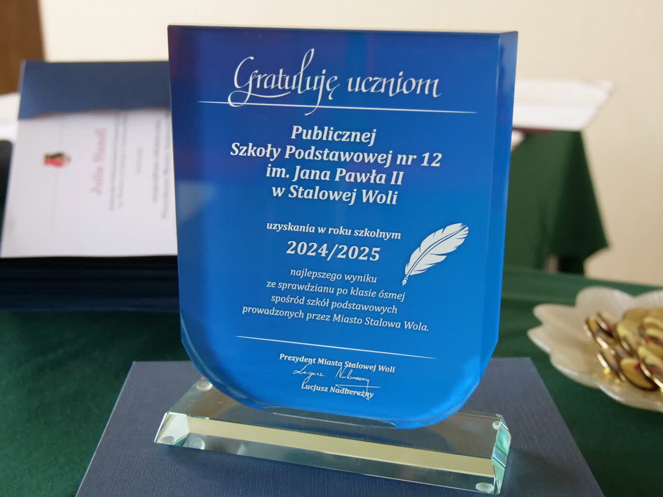 Ważnym punktem programu było wręczenie statuetki dla szkoły z najlepszym wynikiem egzaminu ósmoklasisty. W tym roku to prestiżowe wyróżnienie trafiło do stalowowolskiej 'Dwunastki’. Statuetkę z rąk wiceprezydent Stalowej Woli Moniki Pachacz-Świderskiej odebrał dyrektor PSP nr12 Marek Kopera.