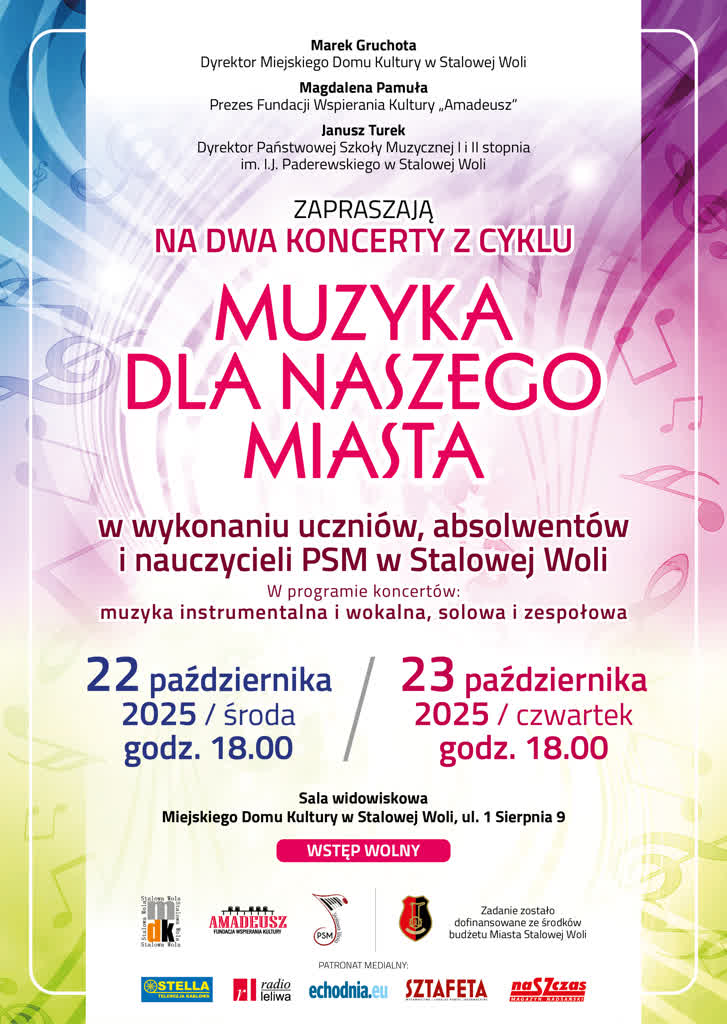 Miejski Dom Kultury w Stalowej Woli, Fundacja Wspierania Kultury „Amadeusz” oraz Państwowa Szkoła Muzyczna I i II stopnia im. I. J. Paderewskiego w Stalowej Woli zapraszają na koncerty z cyklu „Muzyka dla naszego miasta”.