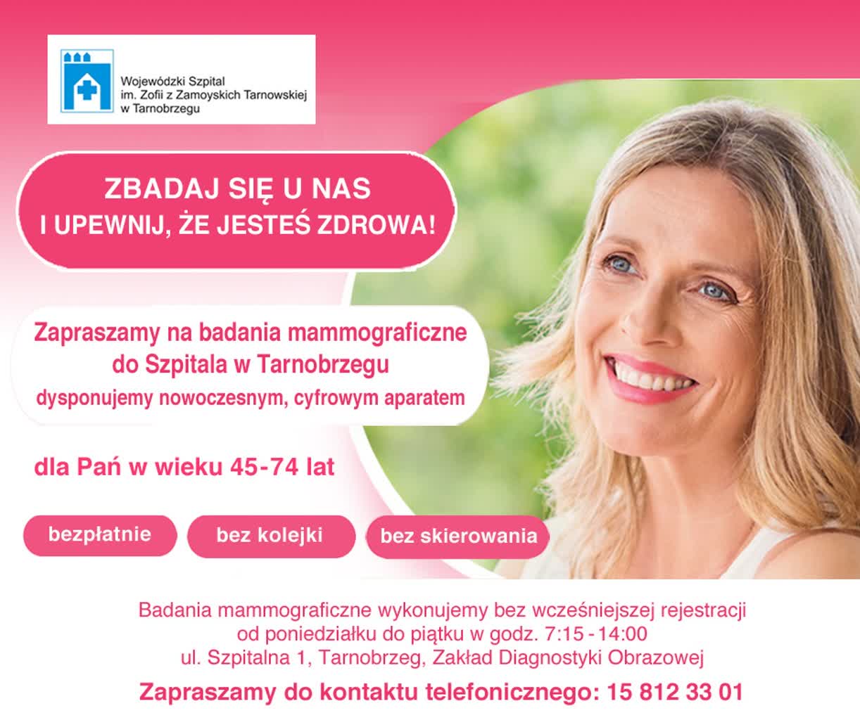W Wojewódzkim Szpitalu imienia Zofii z Zamoyskich Tarnowskiej panie w wieku od 45 do 74 lat mogą skorzystać z bezpłatnych badań mammograficznych. Nie potrzeba skierowania ani wcześniejszej rejestracji – badania wykonywane są od poniedziałku do piątku w godzinach od 7:15 do 14:00. Szpital dysponuje nowoczesnym, cyfrowym aparatem. Szczegółowe informacje udzielane są pod numerem telefonu 15 812 33 01.