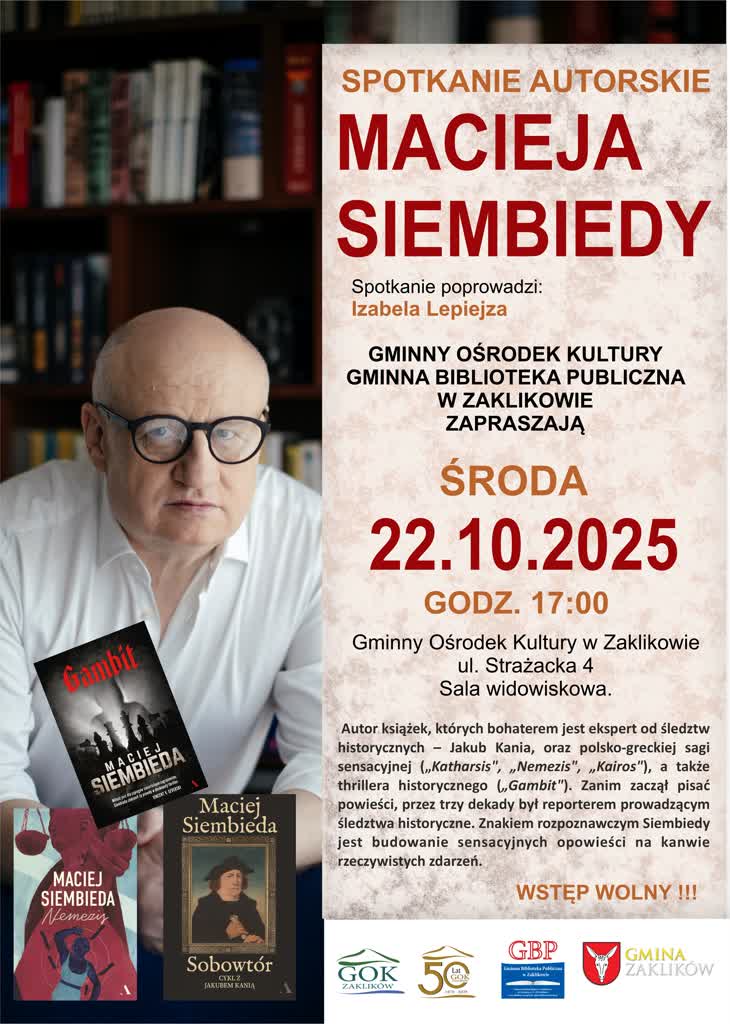 Gminny Ośrodek Kultury oraz Gminna Biblioteka Publiczna w Zaklikowie zapraszają na wyjątkowe spotkanie autorskie z Maciejem Siembiedą, znanym i cenionym autorem thrillerów historycznych oraz powieści sensacyjnych.