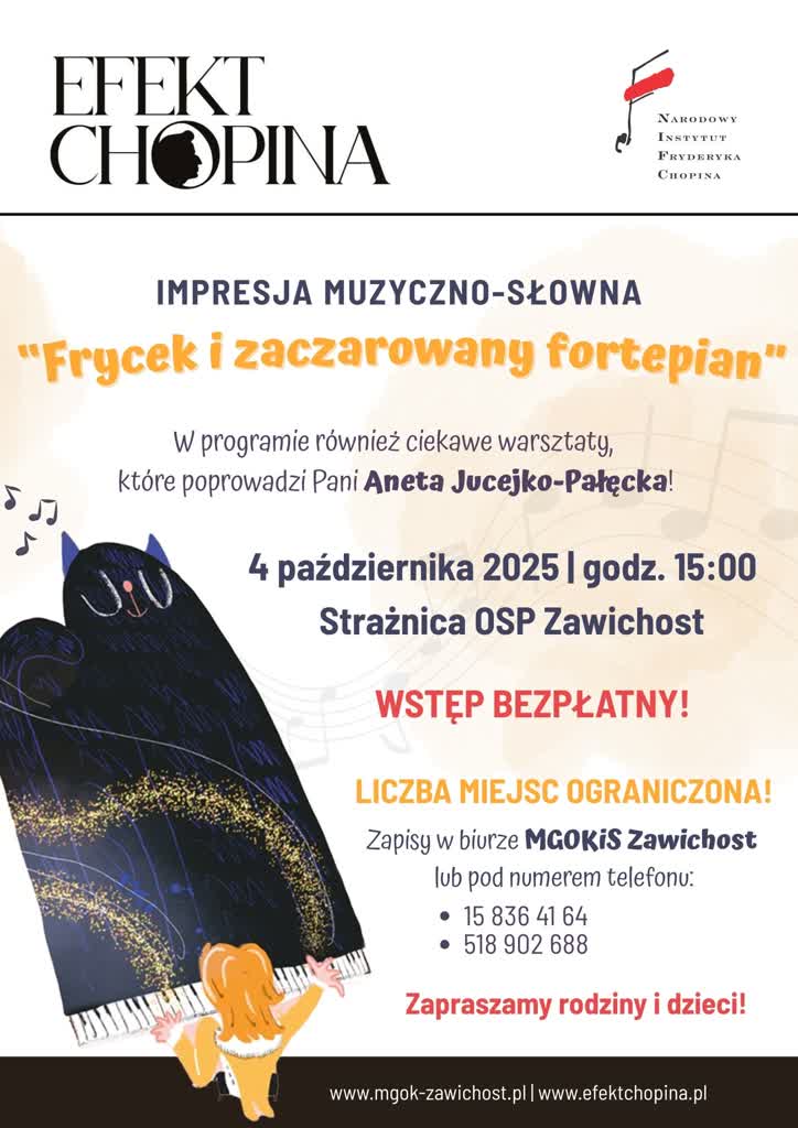 Dziś o godz. 15:00 w Strażnicy OSP Zawichost odbędzie się Impresja Słowno-Muzyczna „Frycek i zaczarowany fortepian” w wykonaniu pianisty Tomasza Pawłowskiego oraz aktorów Anety Jucejko-Pałęckiej oraz Wojciecha Pałęckiego. Wydarzenie odbywa się w ramach cyklu „Efekt Chopina” przy współpracy z Narodowym Instytutem Fryderyka Chopina.