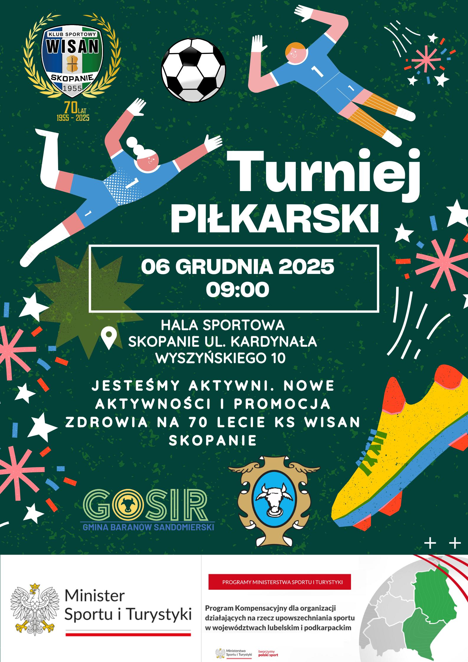 Otrzymane środki pozwoliły na realizację ambitnego planu promowania aktywności fizycznej i zdrowego stylu życia wśród najmłodszych, a także na uczczenie wyjątkowego jubileuszu – 70-lecia istnienia KS Wisan Skopanie. W ramach projektu Klub zaplanował trzy turnieje piłkarskie. Dwa z nich zostały już przeprowadzone, natomiast finałowy turniej odbędzie się 6 grudnia. W wydarzeniu wezmą udział dzieci i młodzież trenująca w Klubie oraz zaproszone drużyny, tworząc sportowe święto będące zwieńczeniem całego programu. Dzięki przyznanemu dofinansowaniu KS Wisan Skopanie zakupił nowy sprzęt sportowy dla dzieci oraz niezbędne materiały promocyjne i organizacyjne. Wszystkie działania realizowane są pod wspólnym szyldem obchodów 70-lecia Klubu, co dodatkowo podkreśla ich wyjątkowy, historyczny charakter. Wsparcie Ministerstwa Sportu umożliwiło nie tylko rozwinięcie oferty szkoleniowej, lecz także stworzenie atrakcyjnych wydarzeń integrujących najmłodszych mieszkańców regionu i wzmacniających rolę sportu w ich życiu. Bez tego dofinansowania realizacja tak szeroko zakrojonego projektu nie byłaby możliwa, a jubileuszowy rok zyskał dzięki niemu szczególny wymiar.