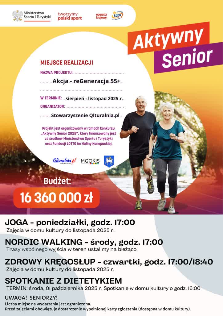 Stowarzyszenie Qlturalnia.pl z Koprzywnicy realizuje projekt „reGeneracja 55+”, skierowany do mieszkańców powyżej 55. roku życia. Jego celem jest wzmocnienie kondycji fizycznej i poprawa samopoczucia seniorów poprzez regularne zajęcia ruchowe oraz działania prozdrowotne.