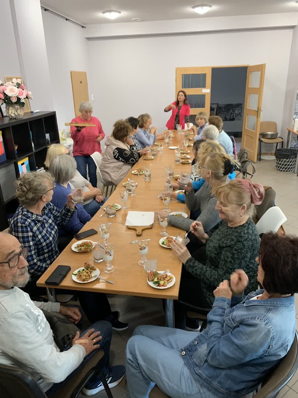 Do tej pory dwa razy w tygodniu uczestnicy mogli bezpłatnie brać udział w ćwiczeniach na matach – zdrowy kręgosłup i joga – prowadzonych w domu kultury dzięki współpracy z Miejsko-Gminnym Ośrodkiem Kultury i Sportu. Zakupiono także sprzęt pomocniczy, m.in. piłki i gumy gimnastyczne. Treningi poprawiały sprawność, redukowały napięcie i wspierały równowagę psychiczną. Do końca września grupa uczestniczyła również w marszach Nordic Walking, wybierając trasy dostosowane do możliwości wszystkich seniorów. Seniorzy wzięli także udział w spotkaniu warsztatowym z dietetykiem, podczas którego poznali zasady zdrowego żywienia w wieku dojrzałym, a następnie wspólnie przygotowali i degustowali wartościowe posiłki. Nad bezpieczeństwem zdrowotnym uczestników przez cały czas trwania projektu czuwała wykwalifikowana kadra medyczna.