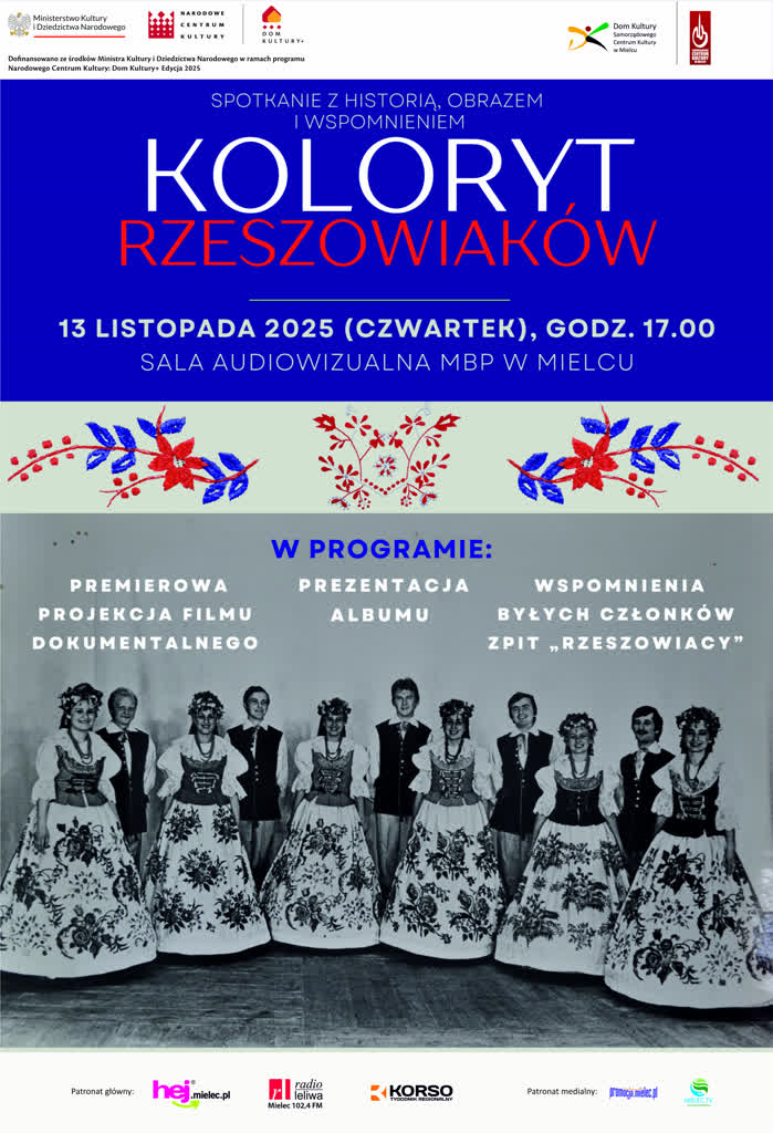 Wydarzenie „Koloryt Rzeszowiaków” będzie mieć miejsce 13 listopada o godz. 17.00 w sali audiowizualnej Miejskiej Biblioteki Publicznej w Mielcu. Wstęp wolny. Patronat Radio Leliwa.