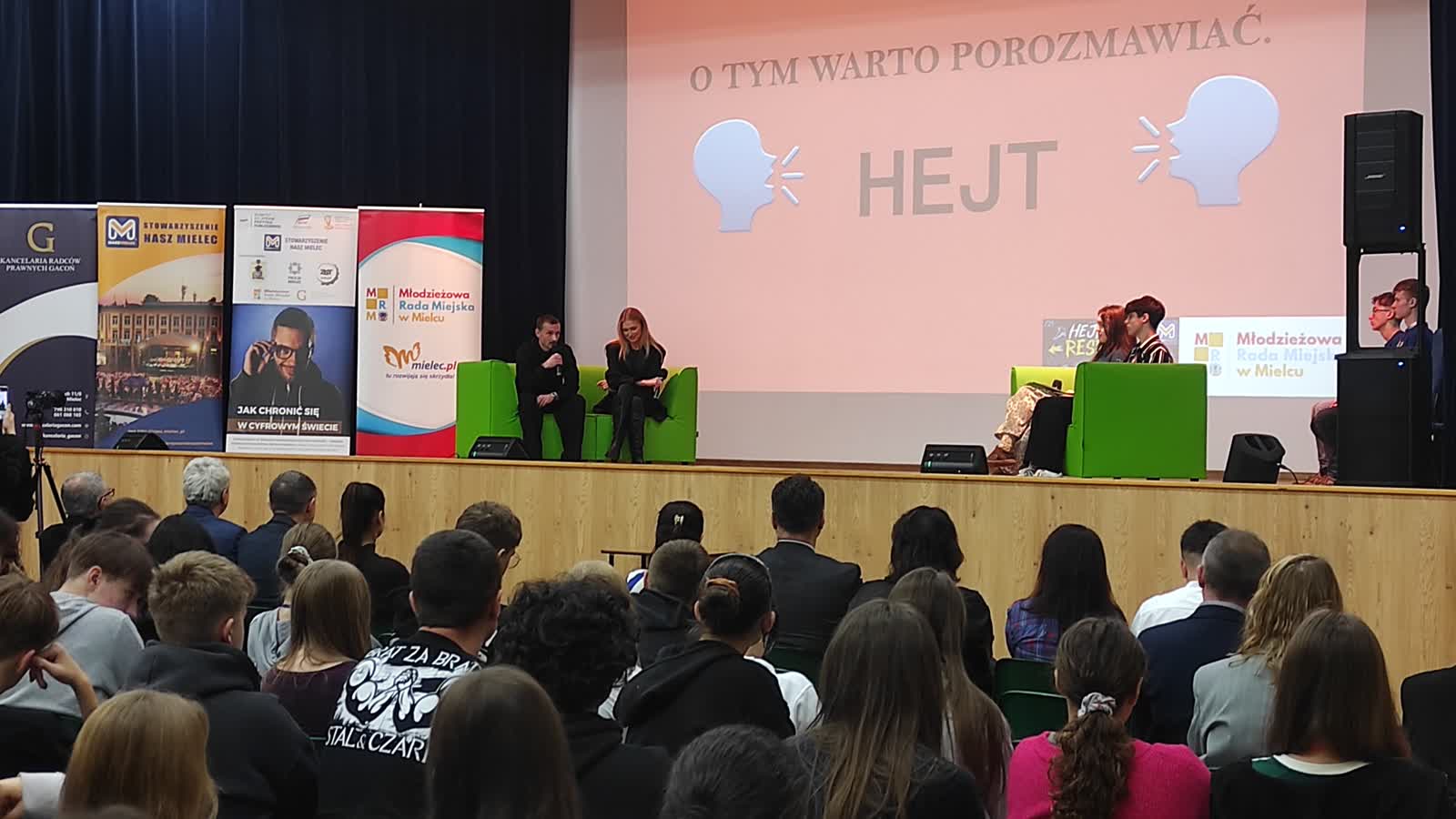 Stowarzyszenie Nasz Mielec zorganizowało spotkanie edukacyjne dla młodzieży „HEJT OFF, RESPECT ON”, poświęcone bezpieczeństwu cyfrowemu, przeciwdziałaniu hejtowi oraz przemocy w internecie. Wydarzenie, które miało miejsce w auli Zespołu Szkół Technicznych w Mielcu zgromadziło blisko 300 uczniów mieleckich szkół średnich, co pokazało, że młodzież chce świadomie i odpowiedzialnie poruszać się w świecie cyfrowym oraz szuka wartościowych inicjatyw, które pomagają wzmocnić ich kompetencje.