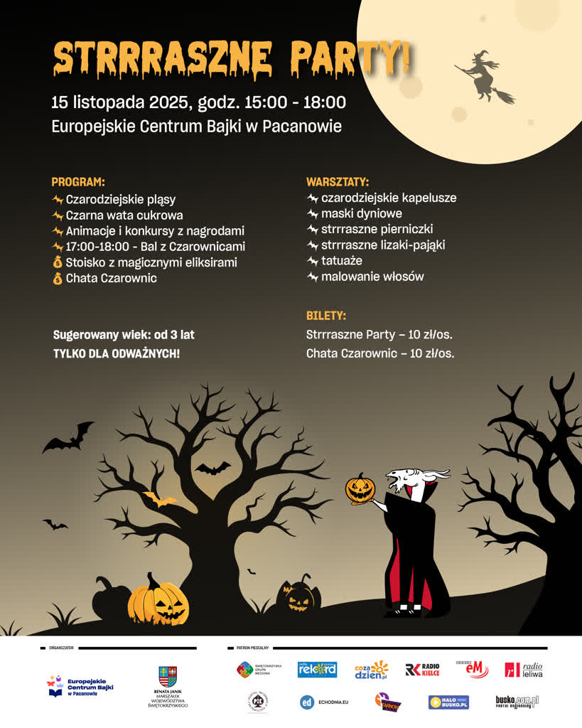 W Pacanowie obudzi się magia! Już 15 listopada w godz. 15:00–18:00 Europejskie Centrum Bajki zaprasza wszystkie czarownice, duchy, wampirki i potworki na najbardziej upiorną zabawę roku!