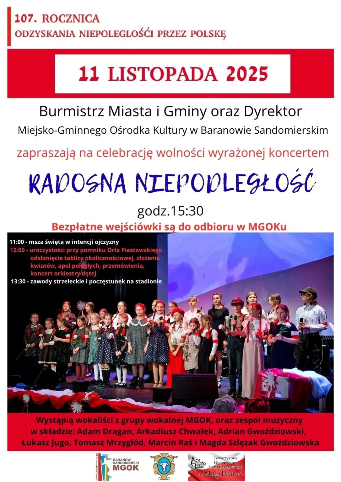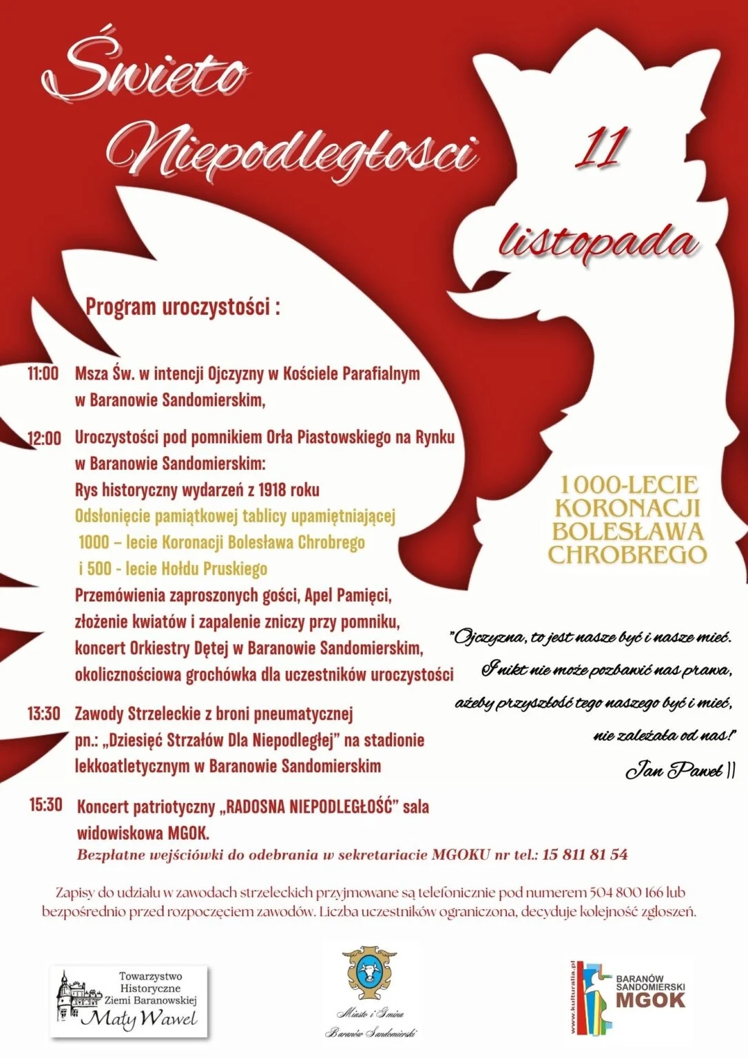 W Baranowie Sandomierskim obchody Narodowego Święta Niepodległości rozpocznie o godzinie 11 msza w intencji ojczyzny, która zostanie odprawiona w kościele parafialnym. Główne uroczystości rozpoczną się w samo południe na baranowskim rynku. Nastąpi tam odsłonięcie tablicy upamiętniającej 1000 lecie koronacji Bolesława Chrobrego oraz 500 lecie hołdu pruskiego.