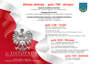 Główne uroczystości rozpoczną się od mszy w intencji ojczyzny, która odprawiona zostanie w kościele pod wezwaniem świętego Franciszka Salezego i świętego Andrzeja Boboli. Po nabożeństwie program artystyczny zaprezentują uczniów Szkoły Podstawowej nr 2 im. Jana Pawła II w Gorzycach. Złożone zostaną także kwiatów pod Pomnikiem Wojennym oraz pomnikiem bł. ks. Jerzego Popiełuszki.