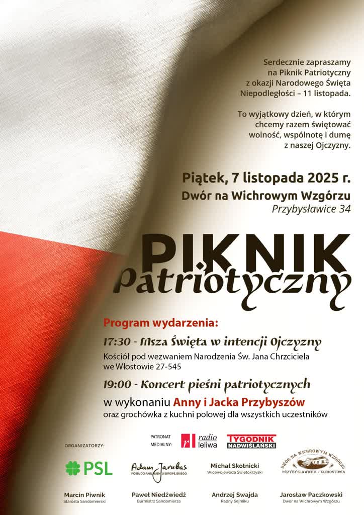 Już w najbliższy piątek w „Dworze na Wichrowym Wzgórzu” w Przybysławicach kolo Klimontowa odbędzie się „Piknik Patriotyczny”.
