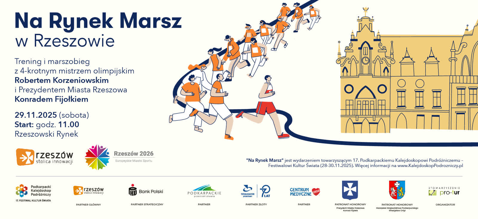 Już 29 listopada na rzeszowskim Rynku odbędzie się trening marszobiegowy z udziałem Roberta Korzeniowskiego, czterokrotnego mistrza olimpijskiego oraz Prezydenta Rzeszowa Konrada Fijołka. Wydarzenie towarzyszy 17. Podkarpackiemu Kalejdoskopowi Podróżniczemu – Festiwalowi Kultur Świata, który 28–30 listopada odbędzie się w centrum ZEN.COM Expo w Jasionce.