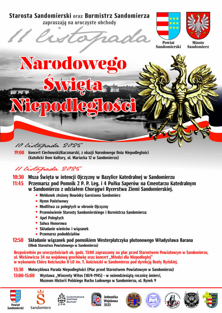 Ww wtorek (11 listopada) o 10 30 w katedrze rozpocznie się msza święta w intencji ojczyzny pod przewodnictwem biskupa Krzysztofa Nitkiewicza. Następnie w uroczystym przemarszu z udziałem Chorągwi Rycerstwa Ziemi Sandomierskiej uczestnicy przejdą na Cmentarz Katedralny, gdzie pod pomnikiem 2 Pułku Piechoty Legionów AK i 4. Pułku Saperów będzie miała miejsce dalsza oficjalna część spotkania. Następnie na placu pod budynkiem Starostwa Powiatowego odbędzie się motocyklowa parada niepodległości, występy artystyczne i poczęstunek wojskową grochówką.